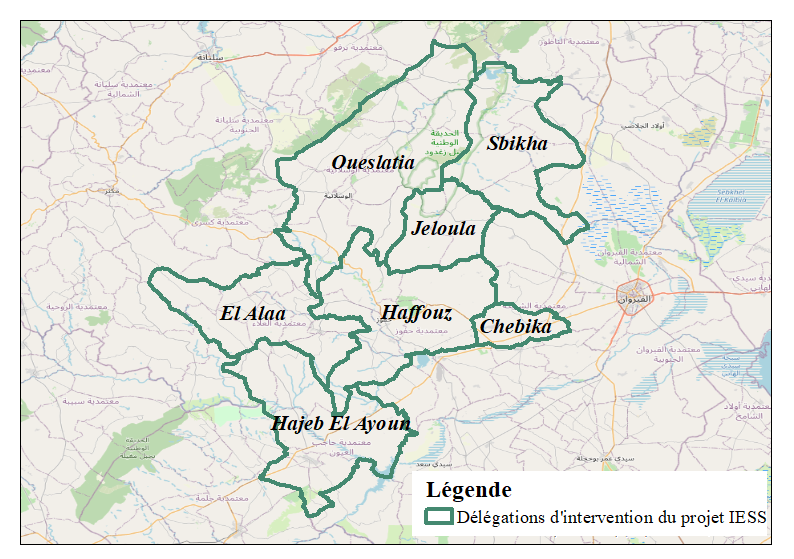 Le projet intervient dans 35 secteurs ruraux de la zone collinaire de Kairouan répartis sur 7 délégations (Hajeb Laâyoune, Oueslatia, Ain Jloula, Sbikha, El Alâa, Haffouz et Chébika).